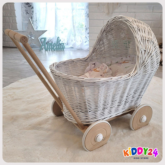 Korbkinderwagen für Puppen in Weiß – Liebevoll Handgefertigt & Elegant