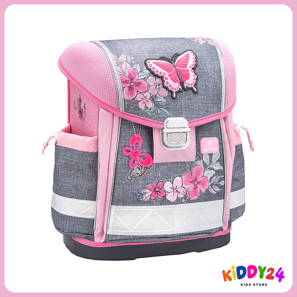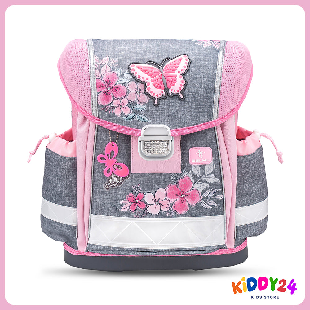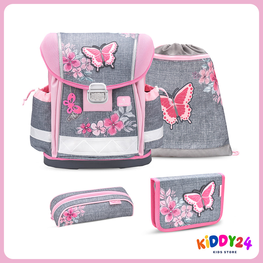 Reflektierende Elemente erhöhen die Sichtbarkeit im Straßenverkehr, während die leicht bedienbare Metallschnalle für zusätzliche Sicherheit sorgt. Das 4-teilige Set umfasst Schulranzen, Turnbeutel, rundes Federmäppchen, Federtasche und einen Schmetterlings-Schlüsselanhänger. Ein rundum harmonisches Set, das Komfort, Qualität und Stil perfekt vereint.